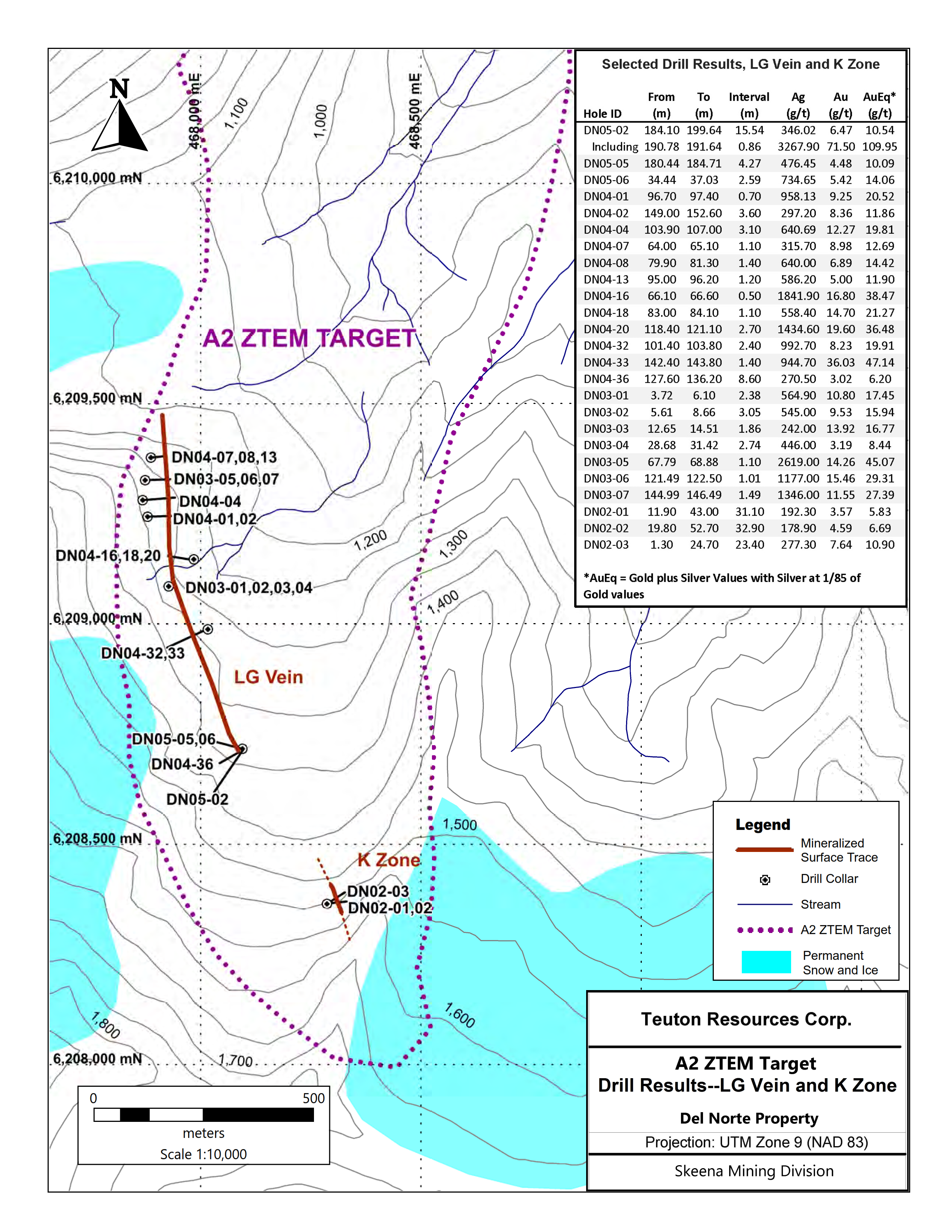 The principal target of the 2019 program is the “A-2” anomaly identified by Geotech during a comprehensive ZTEM survey flown in 2018 (cf: http://teuton.com/Fig1DNTargets). The Geotech anomaly overlies a previous large and intense EM anomaly defined by an earlier 2005 VTEM survey.  Streams draining the area of the anomaly flow southerly into Nelson Creek, where Cominco carried out a placer gold operation in the 1930’s. Two structures, the LG vein and the K zone, lie close to the anomaly but not within it.  Both have returned high gold and silver values in previous drilling (cf. http://teuton.com/Fig2DNDrilling).