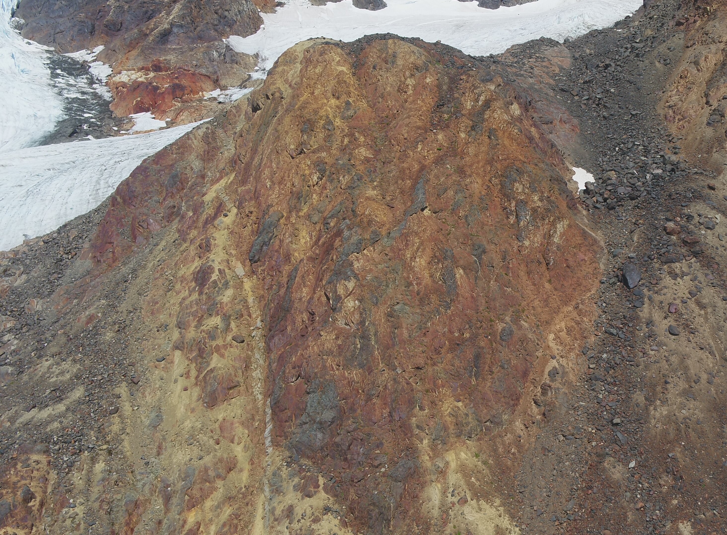 A reconnaissance of areas of glacial meltback has identified two previously unknown gossans in a locale now referred to as “Del Norte West” (Photographs of the zones: http://teuton.com/Fig4Gossan1DNW  and  http://teuton.com/Fig5Gossan2DNW).  Prospecting of a small portion of both gossanous zones has identified widespread pyrite mineralization with local concentrations of chalcopyrite and sphalerite in a silicified hostrock (cf  http://teuton.com/Fig6SamplingDNW).  It is possible that both gossans are connected beneath an intervening icefield.  Samples have been sent for assay and work is continuing in an effort to cover as much of the gossanous region as possible.