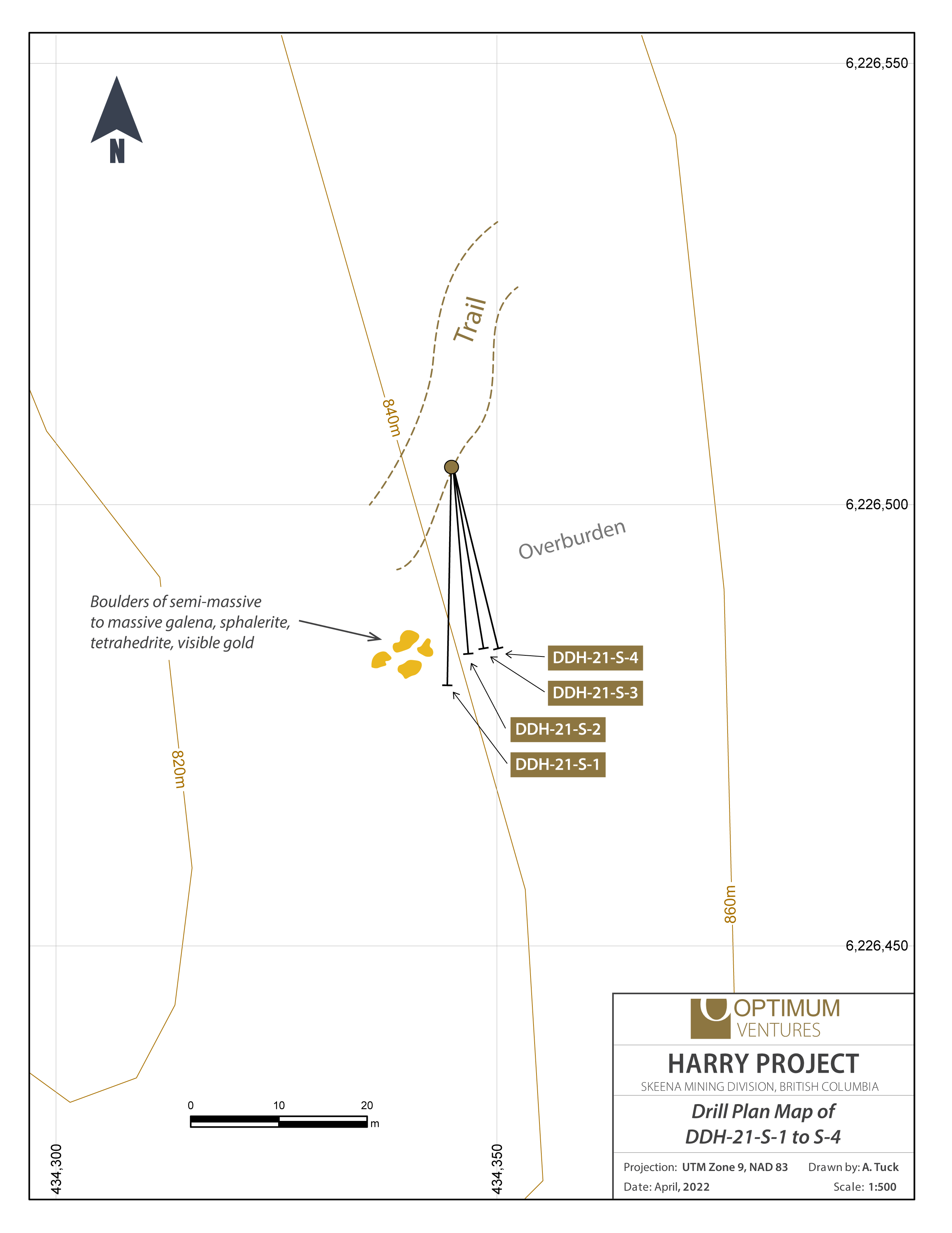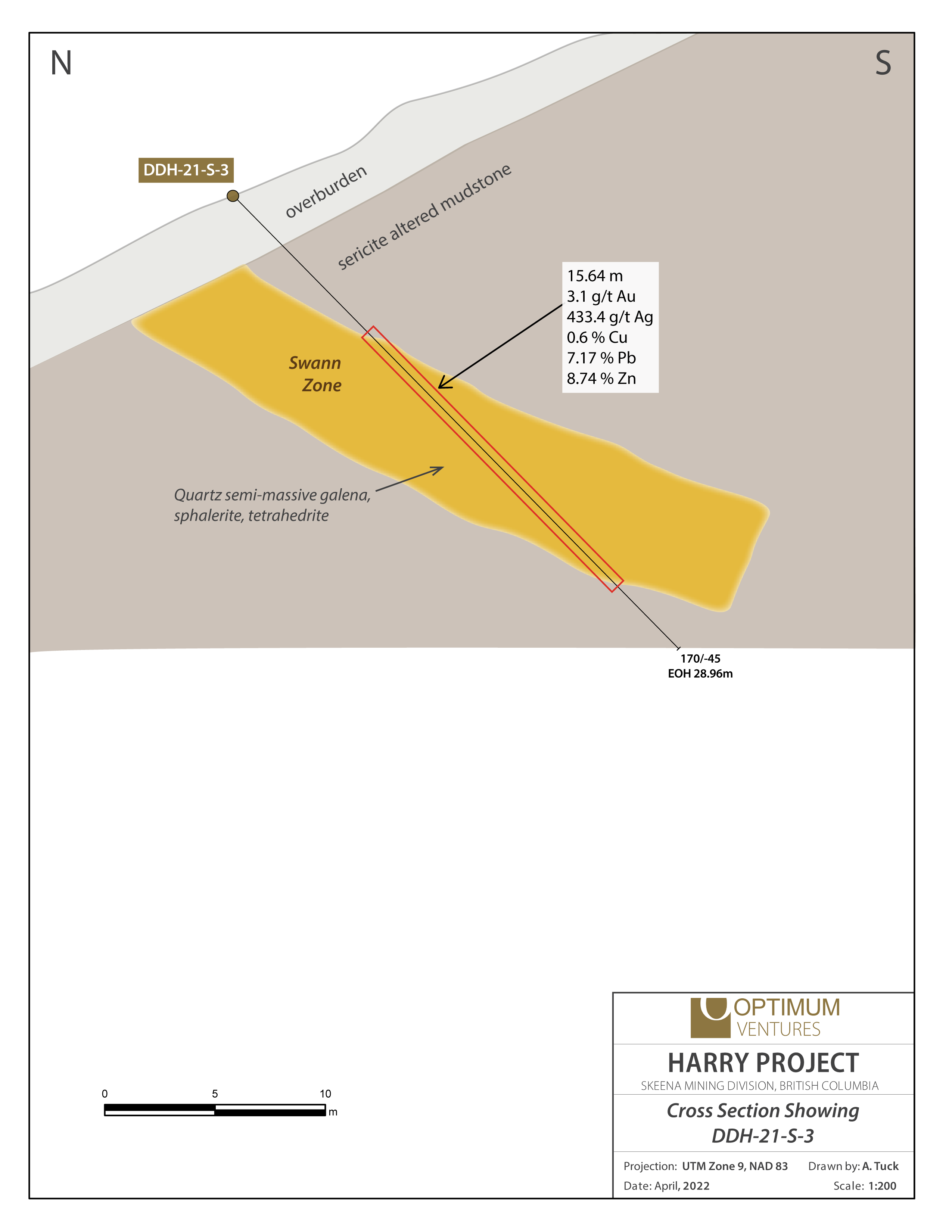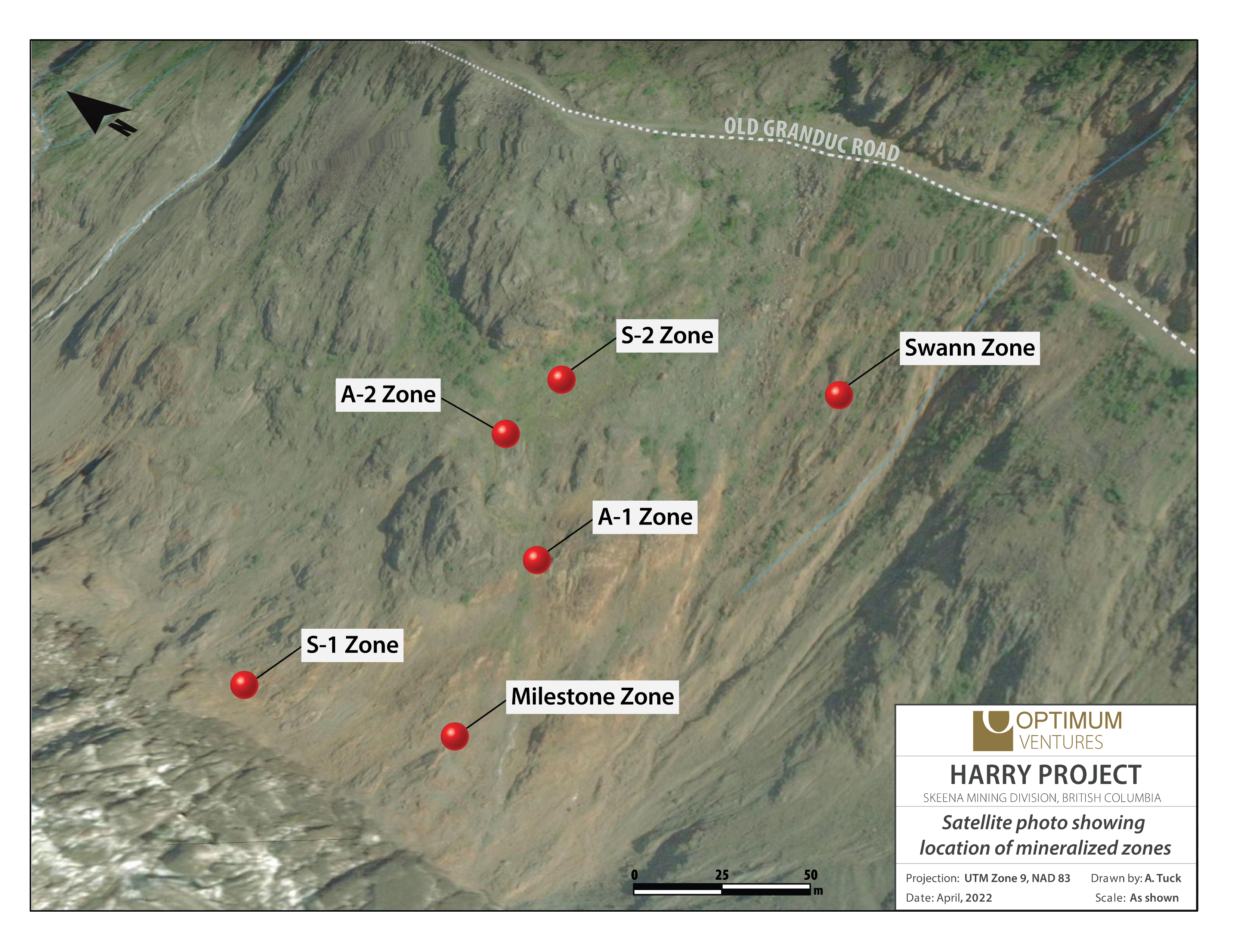 E. Kruchkowski, director of Optimum Ventures stated: “Finding visible gold in massive to semi-massive boulders at surface leading to the discovery of the Swann zone confirms the potential of the Harry property. With the surface results from the Milestone zone discovered in 2020 (7.86 ounces per ton gold [269.5 g/t] across a 2-metre width) and Swann zone drill intersections, the Company is excited for the up coming 2022 exploration program being finalized. The Company initially plans an aggressive program including mapping, sampling and drilling once the 2022 surface work is compiled. The property shows similarities to both the Valley of Kings and Premier deposits based on my experiences working on them. With the rapid ablation of glacial ice and large areas of the property that have not been explored, particularly the bright gossans being exposed, the Company anticipates numerous new exciting discoveries.”