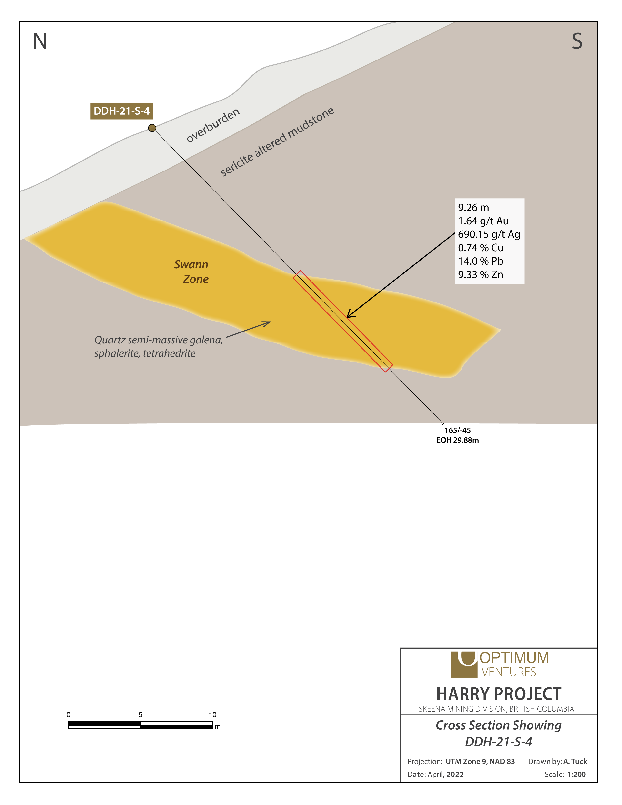 In addition to the drilling, further sampling was undertaken of massive sulfide float boulders found in the vicinity of the Swann zone. Optimum forwarded an additional 16 grab samples taken from Swann zone boulders for assaying along with the core samples. Results from these grab samples on the Swann zone include values up to up 286.2 g/t Au, 2,202 g/t Ag, 62.19 % Pb, 2.87 % Cu and 28.9 % Zn.