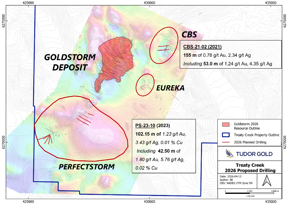 Tudor’s 2026 Treaty Creek Exploration Program has been planned to follow up on its gold discoveries near Treaty Creek’s Goldstorm deposit, which hosts the project’s Mineral Resources. Phase One of the program will follow up on drill results from 2021 and 2022 at the CBS Zone, where drill hole CBS-21-02 encountered 0.78 g/t gold and 2.34 g/t silver over 155.0 meters, including 53.0 meters grading 1.24 g/t gold and 4.35 g/t silver. Initially 2,000 meters of drilling is planned for the CBS Zone, with additional drilling dependent on success. The CBS Zone is at a lower elevation than the other zones identified to date at Treaty Creek and can be drilled both earlier and later in the exploration season than the other known zones.